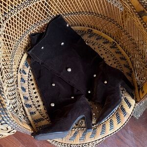 Elegant black heeled boots. Features gold accents. Perfect for stylish outings.