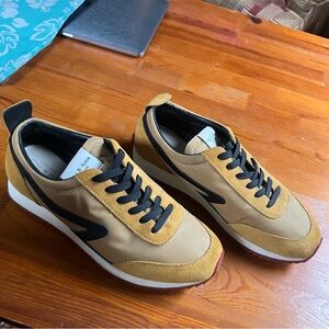 Barely preowned rag & bone retro running shoes in mustard suede and tan nylon with black laces and accents. These shoes are a size 38 which translates to a U.S. size 8 according to the rag & bone size chart. "Fits true to size (TTS). Sleek, low-profile silhouette perfect for athleisure or casual-chic looks."
