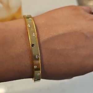 This stunning gold-tone bangle bracelet adds a touch of elegance to any outfit. Perfect for any occasion. -please see photo for 1 missing stone -good used condition