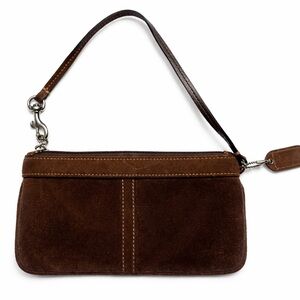 Authentic vintage Coach suede wristlet from the early 2000s (Y2K era) in rich brown suede with leather trim and silver-tone hardware.