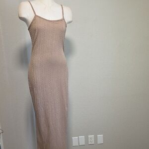 This elegant tan knit dress is perfect for any occasion. Its sleek design offers a flattering fit, making it a versatile addition to your wardrobe; adjustable straps; bodycon;
