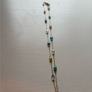 This elegant necklace features a delicate arrangement of multicolor beads, perfect for adding a touch of color to any outfit. The combination of gold, white, blue, and yellow beads creates a versatile and stylish accessory.