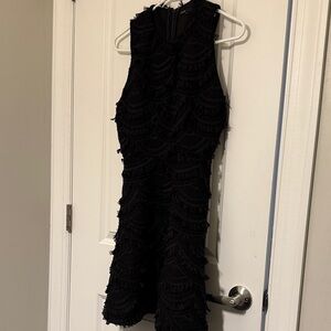 Chic black mini dress with textured design. Perfect for stylish outings.