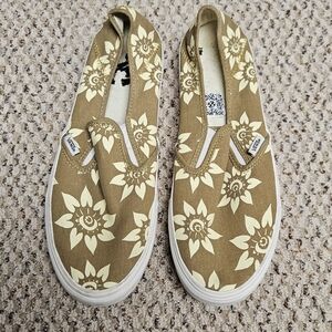 Stylish brown slip-on sneakers with a floral pattern. Comfortable and easy to wear.