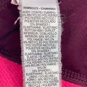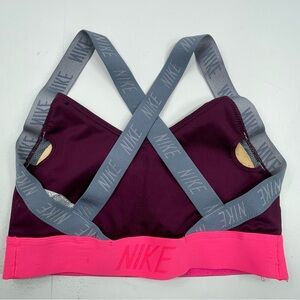 The NIKE Women Pro Indy Logo Crisscrossing Back Elastic Straps Sports Bra in size small features a colorblock pattern with burgundy, fuchsia, and gray accents, this sports bra boasts a crossback style with pullover closure for easy wear. Made from a blend of recycled polyester and spandex, the bra offers compression fit, stretch, padded comfort straps, and mesh inserts for breathability.