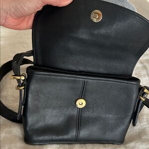 Good vintage condition. Very minor wear (see photos for wear). Zippered pocket on the interior. Snap closure. Comes with original strap and coach tag. Made in USA.