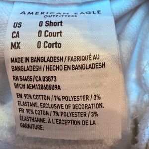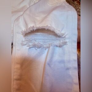 Trendy American Eagle white distressed jeans in size 0 Short 🤍 Perfect crisp white denim with subtle distressing at the knees and raw frayed hems for that effortless, lived-in show-stopper look.
