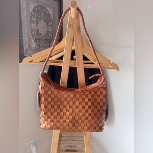 Handwoven carré check leather bag with a smooth leather bottom panel, braided shoulder strap, and zipper closure. The petite, structured shape transitions seamlessly from day to evening.