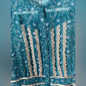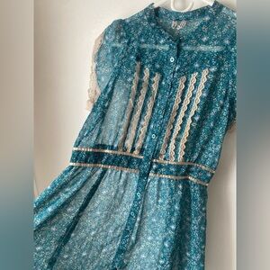 Charming teal mini dress with floral pattern. Features delicate detailing and a playful silhouette. Perfect for casual outings.