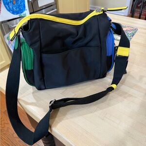 Chic Karl Lagerfeld messenger bag. Black base with bold red, blue, green, and yellow accents. Eye-catching design.