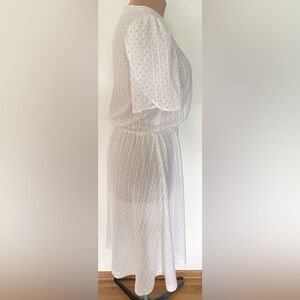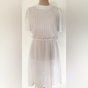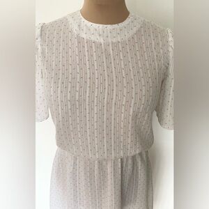 This adorable vintage 80s dress is perfect for those hot summer days! It's made from a lightweight woven material and is semi-sheer with textured "stripes" and pink rosebuds. It has short tulip sleeves, a keyhole button back, and elastic at the waist. It's in excellent condition!