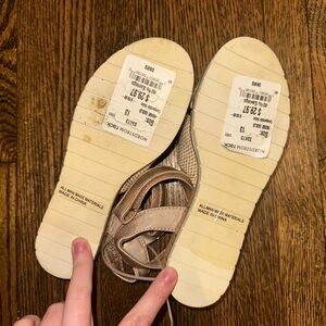Stylish Dolce Vita sandals. Beige woven design. Tan straps. Comfortable fit.