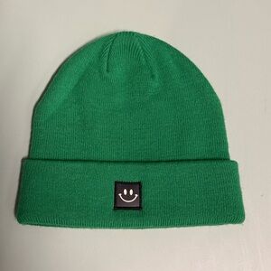 Brighten up your child's outfit with this cheerful green beanie, featuring a fun smiley patch. Ideal for adding warmth and a touch of joy.