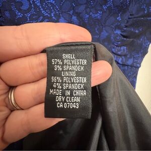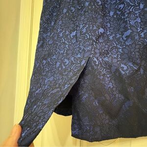 This elegant sheath dress is a wardrobe staple, perfect for weddings, cocktail parties, or a sophisticated night out. It features a beautiful navy blue floral lace overlay with a subtle metallic sheen that catches the light beautifully.