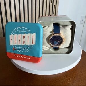 Elegant Fossil watch with navy strap and gold detailing. Includes branded tin.