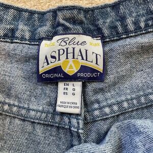 Blue Asphalt wide leg jeans crafted from a heavy-weight acid wash denim. These vintage-inspired pants feature a unique asymmetrical crossover waistband with a double-button fly closure, creating a modern architectural silhouette. The relaxed, straight-cut legs offer a comfortable fit, complemented by a classic five-pocket design and tonal stitching throughout.