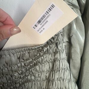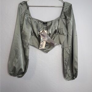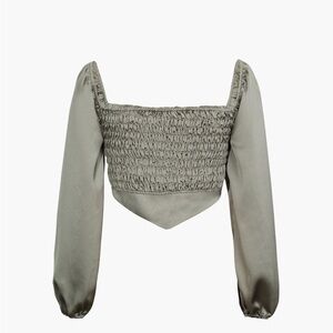 This elegant olive green top features a stylish design with long sleeves and a square neckline. Perfect for any occasion.