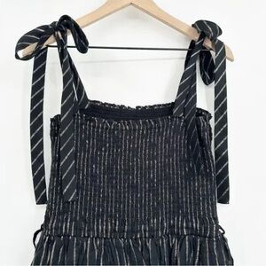 Chic mini dress with shimmering gold stripes. Features playful tiered layers and bow straps. Perfect for a night out.