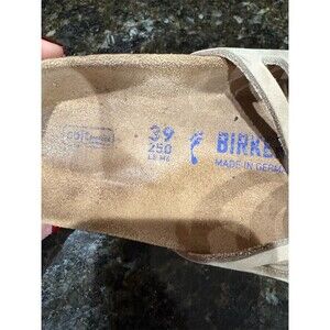Keywords: Birkenstock Granada, women’s sandals, EU 39, US 8, UK 6, beige slides, suede leather, soft footbed, contoured footbed, adjustable buckles, cutout straps, cork insole, rubber outsole, comfort sandal, casual summer shoes