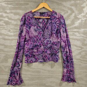 Escada 42/L Vintage Fabulous Purple Floral Long Bell Sleeve Silk Blouse V-Neck