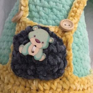 This is a very sweet good size crocheted handmade bear, wearing his suspenders, which are removable.