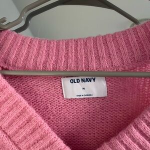 Size XL cozy pink V-neck sweater. Ideal for casual wear. Soft and comfortable fabric. Has an oversized look to it.