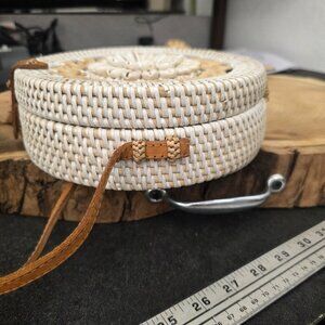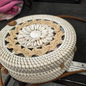 White Wicker Seashells Round Rattan Crossbody Purse Leather Strap Summer boho
