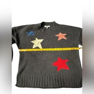 Madewell Starry Night Pullover Sweater in Heather Carbon. Soft extra-fine merino wool with colorful knit stars. Easy, slightly boxy crewneck fit that looks great with jeans and sneakers.