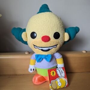 Funko stuffed animal with a cheerful face. Features bright red nose and blue bow tie. Yellow body with purple shirt. Perfect for kids.