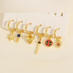 14K Gold Plated Marvel Deadpool & Wolverine Theme Huggie Hoop Dangle Asymmetrical Mismatched Earrings Set
