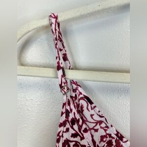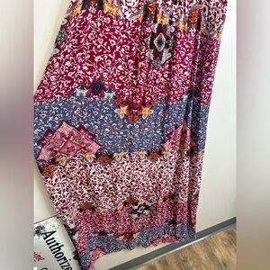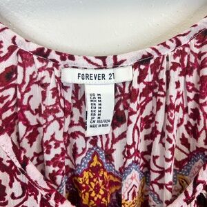 Forever 21 floral print boho maxi dress features adjustable spaghetti straps. Flowy and lightweight. Stylish maxi dress with intricate red and blue patterns. Perfect for casual outings.