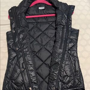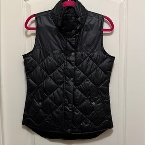 Stylish quilted vest. Sleeveless design. Snap button and zipper closure. Perfect for layering.