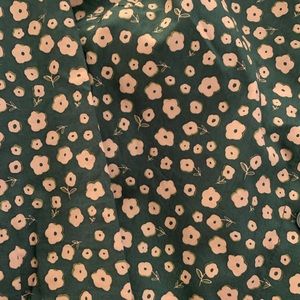Charming green blouse with floral pattern. Features a delicate lace collar. Long sleeves with lace trim.