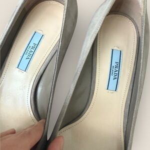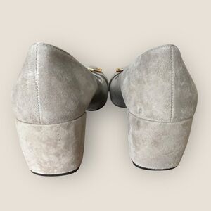 SEO keywords: Prada pumps, vintage Prada shoes, grey suede heels, designer heels, gold buckle pumps, block heel suede shoes