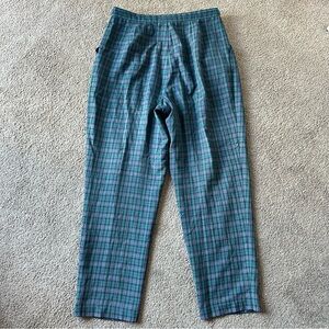 Stylish plaid pants with green and purple pattern. Perfect for any occasion.