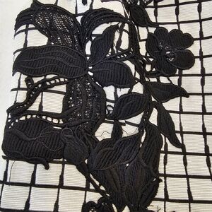 Chic and eye-catching Betsey Johnson mini dress featuring a modern black grid pattern with dimensional floral appliqué accents for added texture and drama. Sleeveless silhouette with a structured, tailored fit that creates a polished, flattering shape.