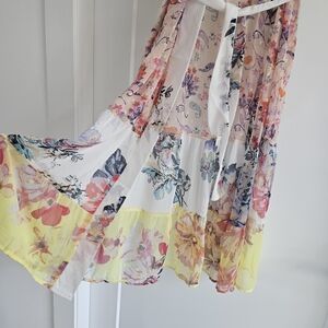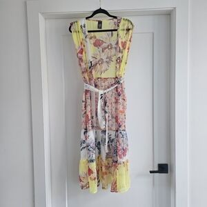 Vince Camuto Sheer Floral Midi Dress w/ Belt - Yellow Pink Watercolor - Coverup