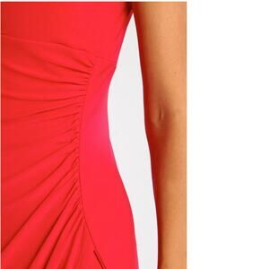 This red dress is a stunning Lauren Ralph Lauren sleeveless jersey sheath dress, characterized by its elegant ruched detailing and faux-wrap silhouette. Perfect for making a memorable entrance at any special occasion, from elegant dinners to vibrant parties.
