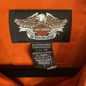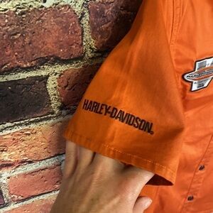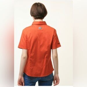 Harley Davidson Orange Women’s Short Sleeve Button Up Shirt with Logos Size M/L in excellent condition.