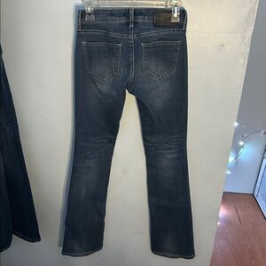 Chic dark blue flare jeans with floral details. Perfect for a stylish look.
