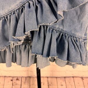 Nasty Gal skirt size 10. Asymmetrical hemline. Ruffles. Light blue denim. Brand new with tags! Smoke free home.