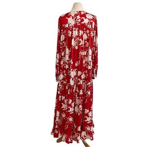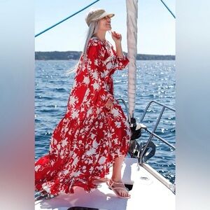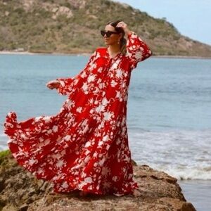 Stunning red maxi dress with cream floral design. Flowy and elegant. Ideal for special occasions.