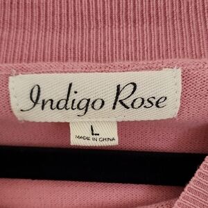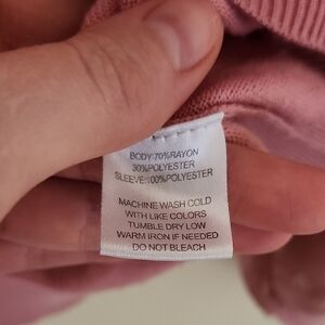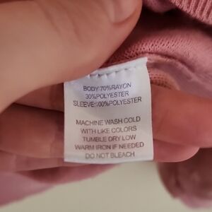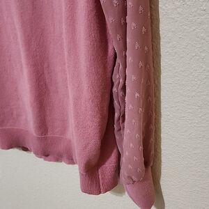 Elegant pink crew neck sweater featuring stylish sheer sleeves. Perfect for adding a touch of sophistication to your wardrobe.