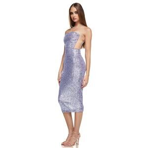 The Nookie Lumiere Sequin Strapless Midi Dress in lilac is a stunning piece that blends glamour with a touch of edge. Adorned with shimmering sequins, the dress features a side mesh panel that adds a hint of allure, making it a perfect choice for any occasion where you want to shine.