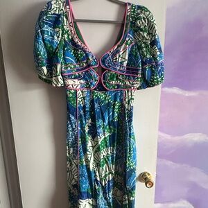 Farm Rio Blue and Green V-Neck Cutout Midi Dress