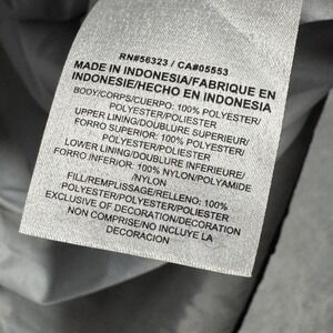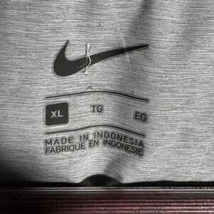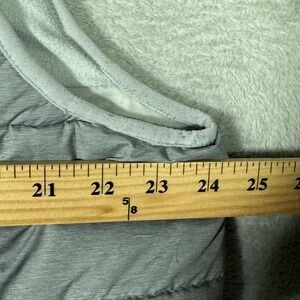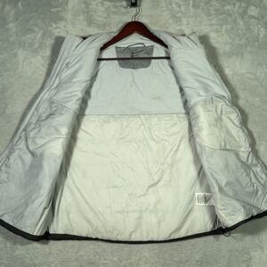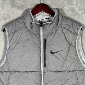 Pre-owned Nike insulated vest with light overall wear from prior use and laundering. Outer shell is clean with light wrinkling from storage, and quilting, zippers, pockets, and drawcord hem are intact and functional with no holes or tears. Interior lining shows several small brownish stains and areas of discoloration near the lower back panel, as shown in the close-up photos. There is a small cut through the check where the size is inside the neck. Does not go all the way through the back of the vest.