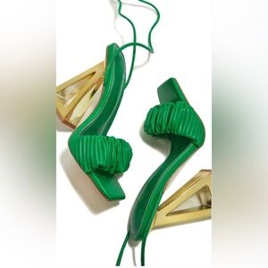 The AZALEA WANG Amie Chunky Sandal In Green is made from a vegan leather upper and features a square open toe silhouette, a ruched toe band, a cushioned insole, a reflective chunky triangle heel, and strappy lace-up cords.