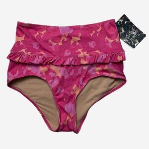 NWT Kortni Jeane High-Waisted Floral Bikini Bottoms Size S Pink Blooms Ruffle