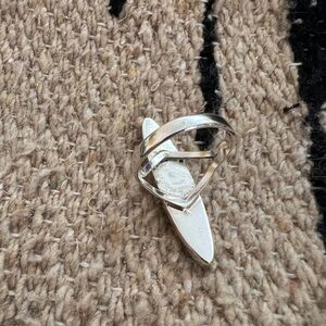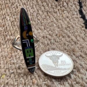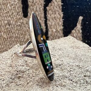 This signed “RD”, Navajo Ray Douglas, galaxy celestial split shank ring features a striking inlaid design on a polished black onyx background. The elongated oval face of the ring showcases a celestial scene with a yellow crescent moon and two yellow circles, juxtaposed with a green, house-like structure with three windows. (It may even represent a robot). The design is further embellished with various inlaid stones, including opal, in rectangular and circular shapes, creating a dynamic and colorful motif. The ring is a size 9.75, measuring 1.56 inches in length. Further measurements are .35”W x .16”D.