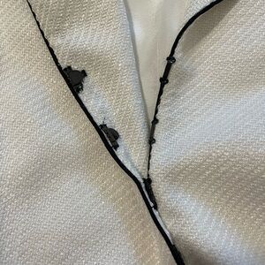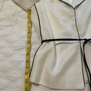 Off white with black leather trim & belt. 3/4 length sleeves, fully lined. Skirt approx 24”. very classic Excellent condition worn one time